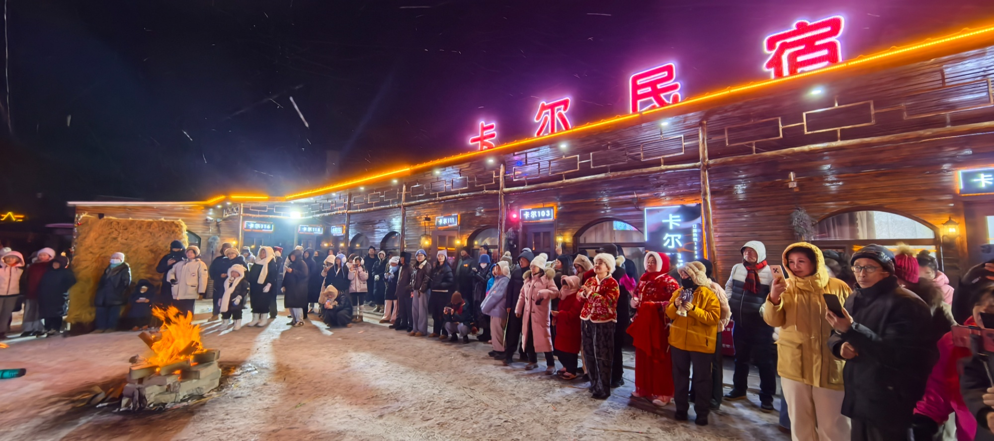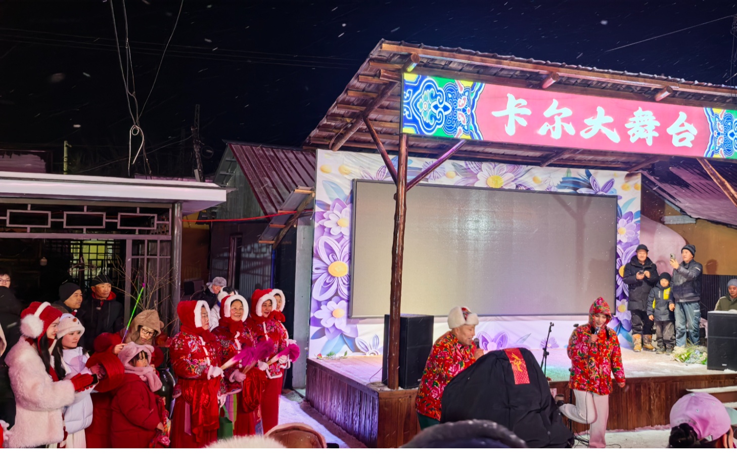 循着欢声笑语来到卡尔民宿,这里堪称“夜间快乐制造机”。舞台上,东北二人转的地道唱腔此起彼伏,演员们诙谐的表演、夸张的动作逗得全场捧腹,不少游客被邀请上台同台飙戏,生疏却认真的模样引得掌声雷动;雪地里,大秧歌的鼓点铿锵有力,红绸飞舞间,游客们自发加入队伍,跟着舞者扭腰摆胯,哪怕动作不协调,也乐在其中。最嗨的当属雪地蹦迪环节,动感音乐一响,游客们在松软的雪地上尽情跳跃、摇摆,荧光棒与雪地反光交相辉映,尖叫声、欢呼声汇成最鲜活的冬日乐章。
