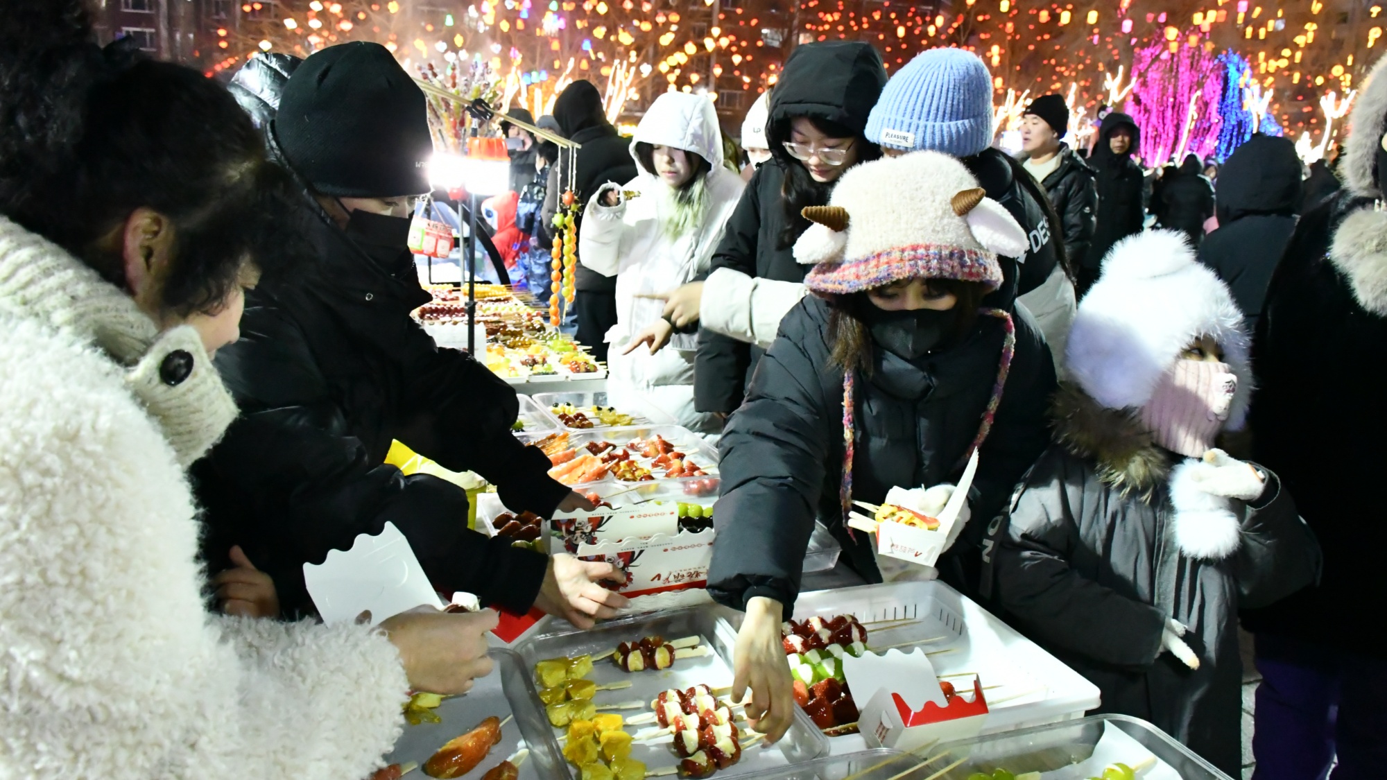 作为林口县冰雪文旅的全新IP,“祥瑞小雪鹅”雪雕堪称文化融合的匠心之作。雪雕坐落在广场核心区域,体态圆润尽显黑土温情,成为冬日里最亮眼的文化符号。环绕雪雕的景观集群更添韵味:灯笼长廊流光溢彩,“冰雪之约·林口共鉴”签名墙与“我与林口的记忆”影像墙对称呼应,老照片里的城市变迁与新征程上的美好期许交织,构成历史传承与展望未来的时空对话。特色摊位组成的展示体验区人气鼎盛,糖葫芦的酸甜、烧烤的鲜香与林口大鹅、奎山粉条、沙棘等特产的醇厚香气弥漫广场,让市民在赏景之余尽享舌尖美味。