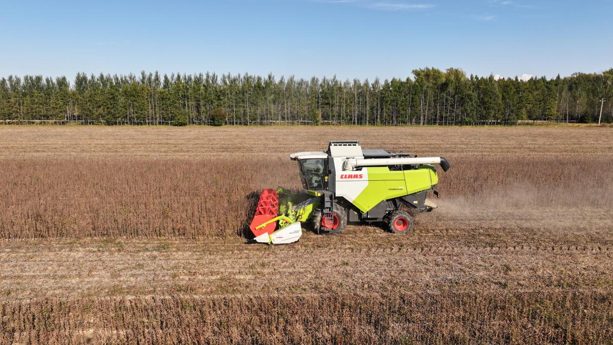 八五七农场第九管理区的大豆收获现场,一台新引进的克拉斯大型收获机往来穿梭,全力以赴推进大豆收获进度,相较其他机型,这台新机械的大豆收获速度提高了40%-50%(央广网发 杜立伟 摄)