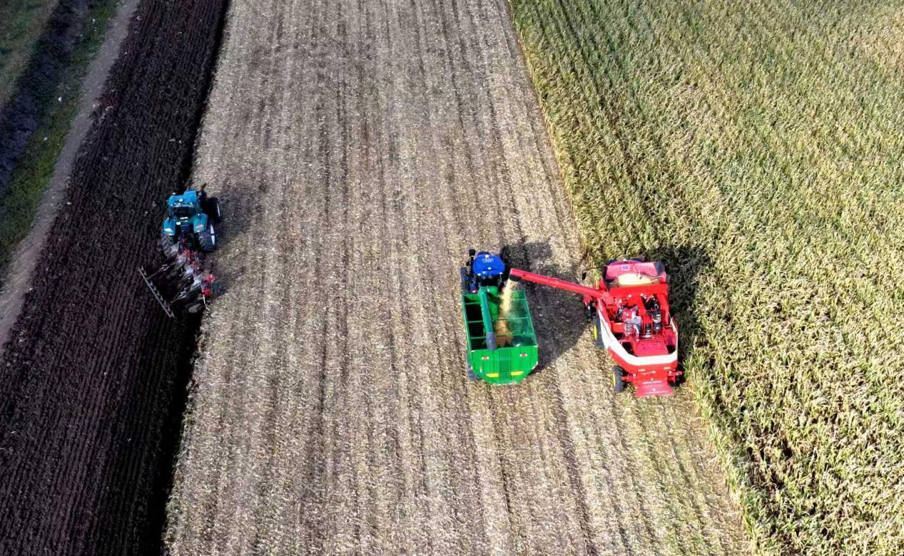 北大荒农业股份友谊分公司国产无人驾驶收获机,接粮车协同作业收玉米,无人驾驶拖拉机同步进行翻地作业(央广网发 徐宏宇 摄)