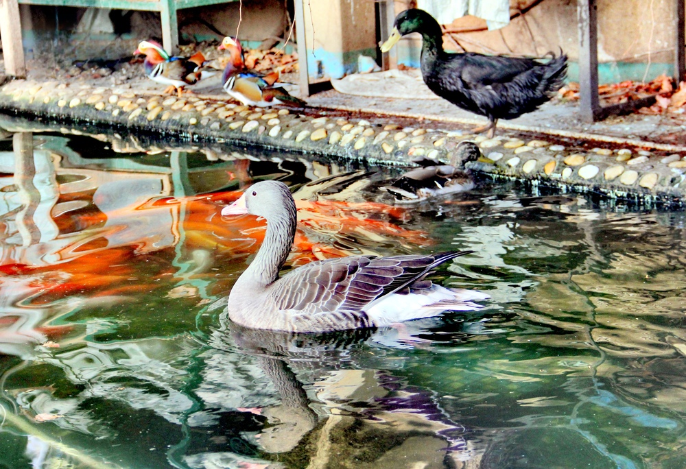 12月1日,哈尔滨市兆麟公园玻璃暖房内,多只受伤的候鸟“悠闲”地生活着。它们有的在水池中游弋,有的在吃鸟食,有的在岸边休息。