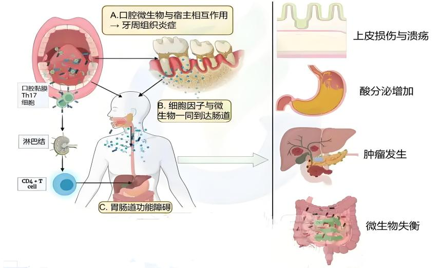 牙周袋内大量的高致病性细菌会随着唾液、食物和吞咽动作持续地向消化道“输送”有害物质和细菌,破坏肠道原有的菌群平衡,破坏肠道黏膜屏障,随之可能发生消化系统炎症甚至肿瘤病变,促进消化系统疾病的发生。此外,牙周炎的持续炎症状态,会持续释放炎症因子进入血液循环,增加消化系统疾病的发生风险。