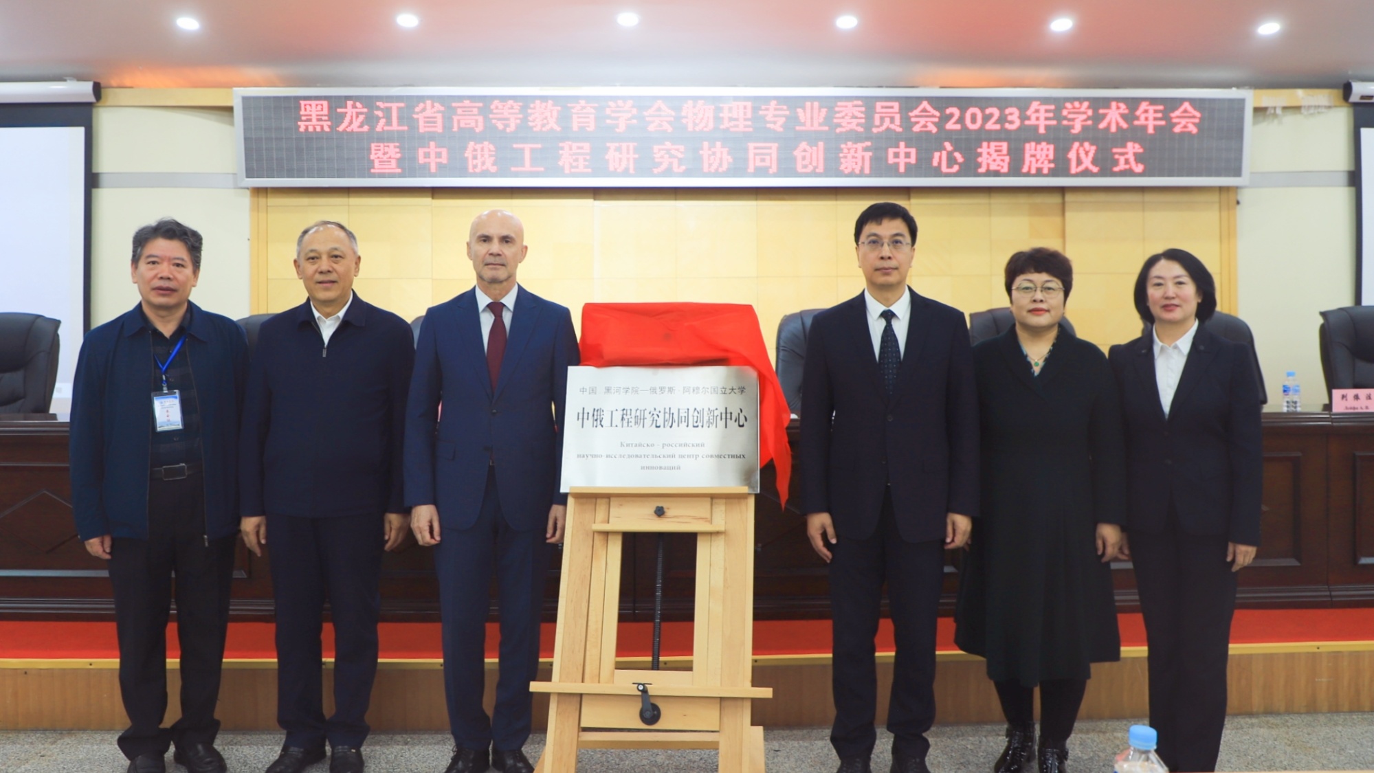 俄罗斯阿穆尔国立大学校长普卢滕科·安德烈·多利耶维奇,黑龙江省高等教育学会物理专业委员会理事长吕树臣,哈尔滨学院副校长宋国利,黑河学院党委副书记、院长杨敬民分别在揭牌仪式上致辞。