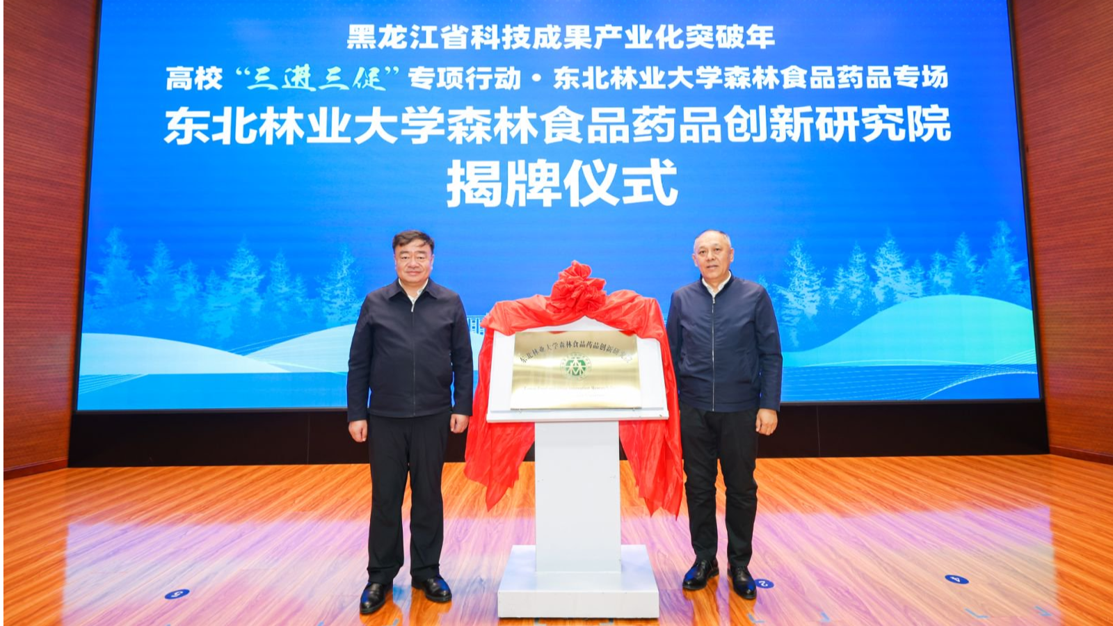 活动现场,东北林业大学党委书记孙猛与省科技厅二级巡视员王喜林为“东北林业大学森林食品药品创新研究院”揭牌。研究院依托学校生物学、药学等优势一级学科,以及“生物资源生态利用国家地方联合工程实验室”等多个高水平科研平台,聚焦龙江森林“林药”“林果”“林菌”等健康产业相关生物资源开发利用核心领域,打造森林食品药品领域的“产学研用”一体化创新平台。研究院院长滕春波表示:“我们将利用人工智能、基因编辑等新技术,突破森林资源开发不足、产品链短等瓶颈,为龙江生物经济发展提供科技支撑。”