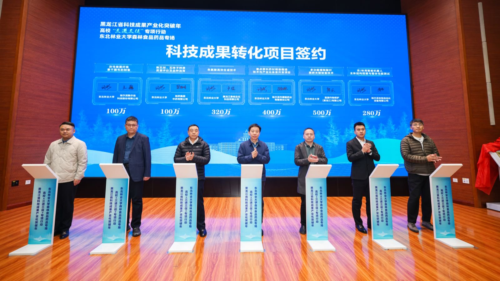 当天,东北林业大学与泰来县、肇东市等六个县市签署校地合作协议,推动科研成果在龙江大地落地生根、开花结果;6个产学研合作项目成功签约,总金额达1700万元,合作领域涵盖药用资源开发、生物制造、智能装备等多个产业关键环节。特别值得一提的是,5项科技成果转化培育基金产业化项目同步启动,项目聚焦龙江产业发展关键技术突破,将成为推动科技成果落地的重要载体。