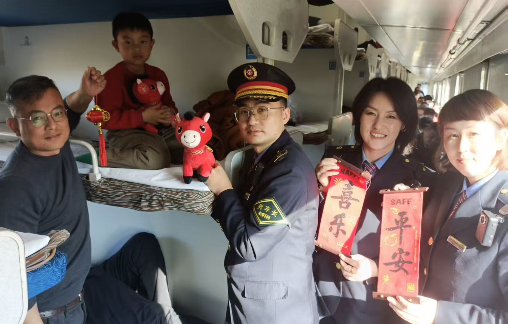 C942次列车工作人员向旅客送上新年祝福(牡丹江客运段供图)