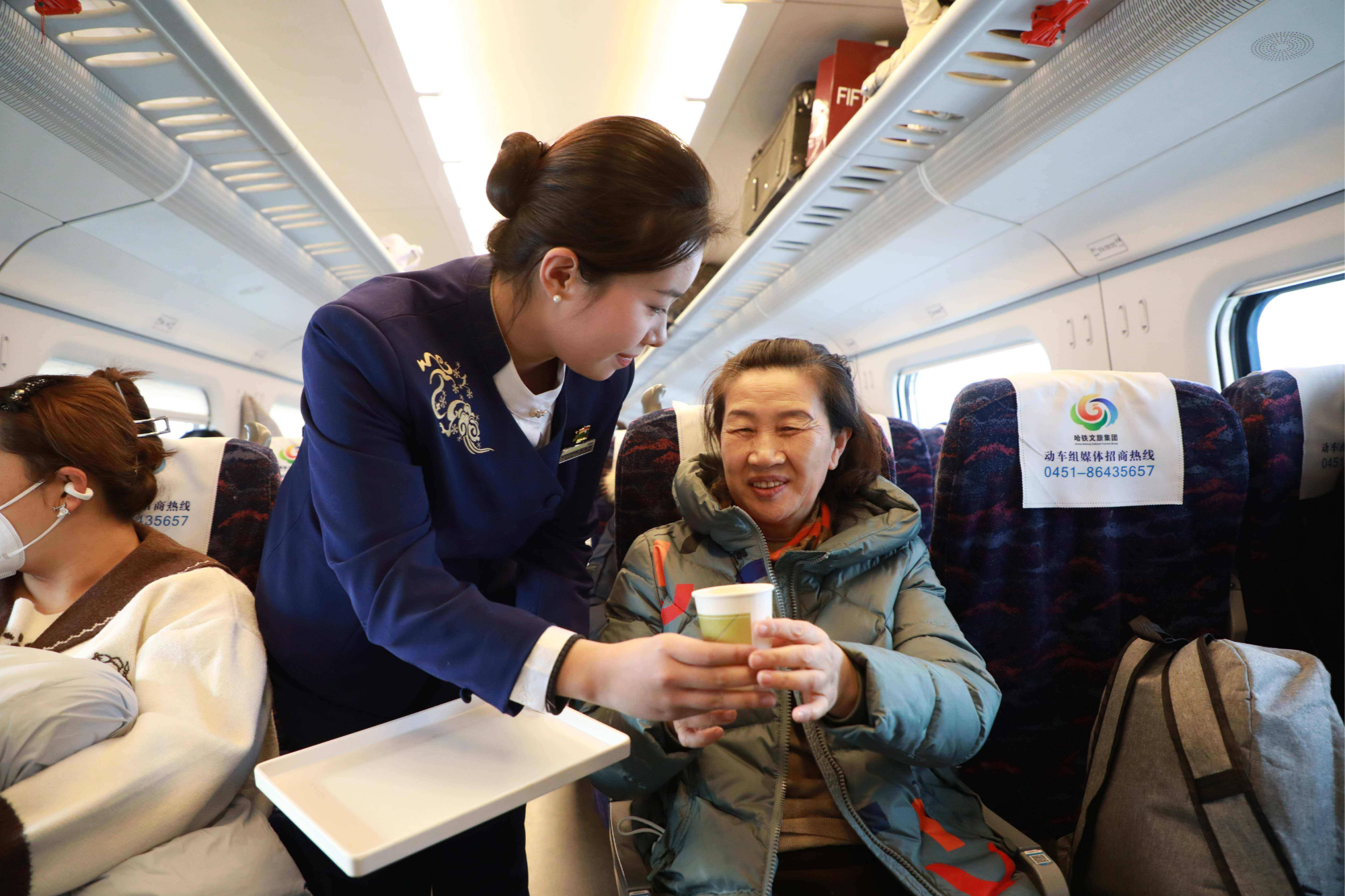 除了环境布置,丰富多彩的文化互动活动更是拉近了工作人员与旅客的距离。在佳木斯开往哈尔滨的C942次列车上,哈佳动车车队的工作人员与旅客一起唱歌、合影,共同迎接新年。旅客们纷纷拿出手机记录这难忘瞬间,向家人朋友送上云端祝福。