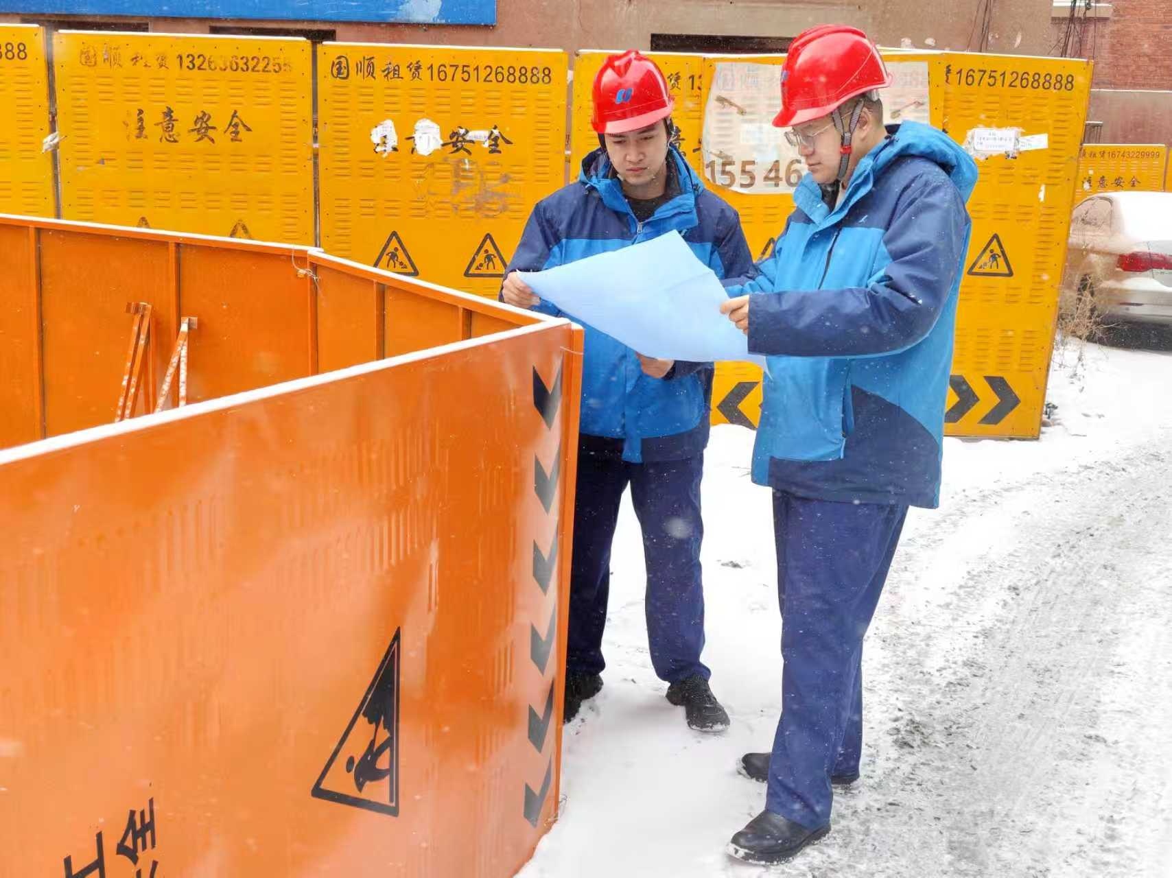 8点45分,天微亮,自检修队长张健带领抢修队伍驾着发电车、钩机等专业设备准时到场。安生部主管陈明阳蹲在雪地上,摊开管线图纸,手指顺着线条仔细核对线位走向和埋深,结合现场地形反复琢磨,快速优化开挖方案。黄色的安全围挡很快在路面搭建起来,将作业区域与行人车辆隔离开,一抹亮眼的黄,成为寒街里的“安全屏障”。