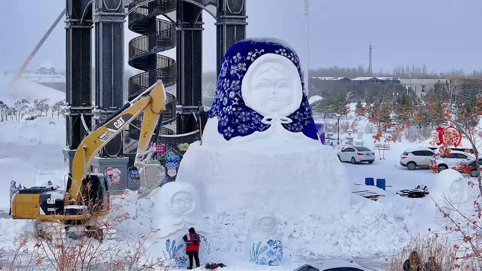 走进俄罗斯风情园的施工现场,雪铲飞舞,雪屑纷扬,工匠们正在对一座体形硕大的套娃雪坯进行精细加工。不同于传统套娃,这座雪雕的装饰纹样别具匠心,赫哲族独特的鱼形、波浪等文化符号与俄罗斯传统图案交织在一起,既有异域风情,又深深植根于本地特色。