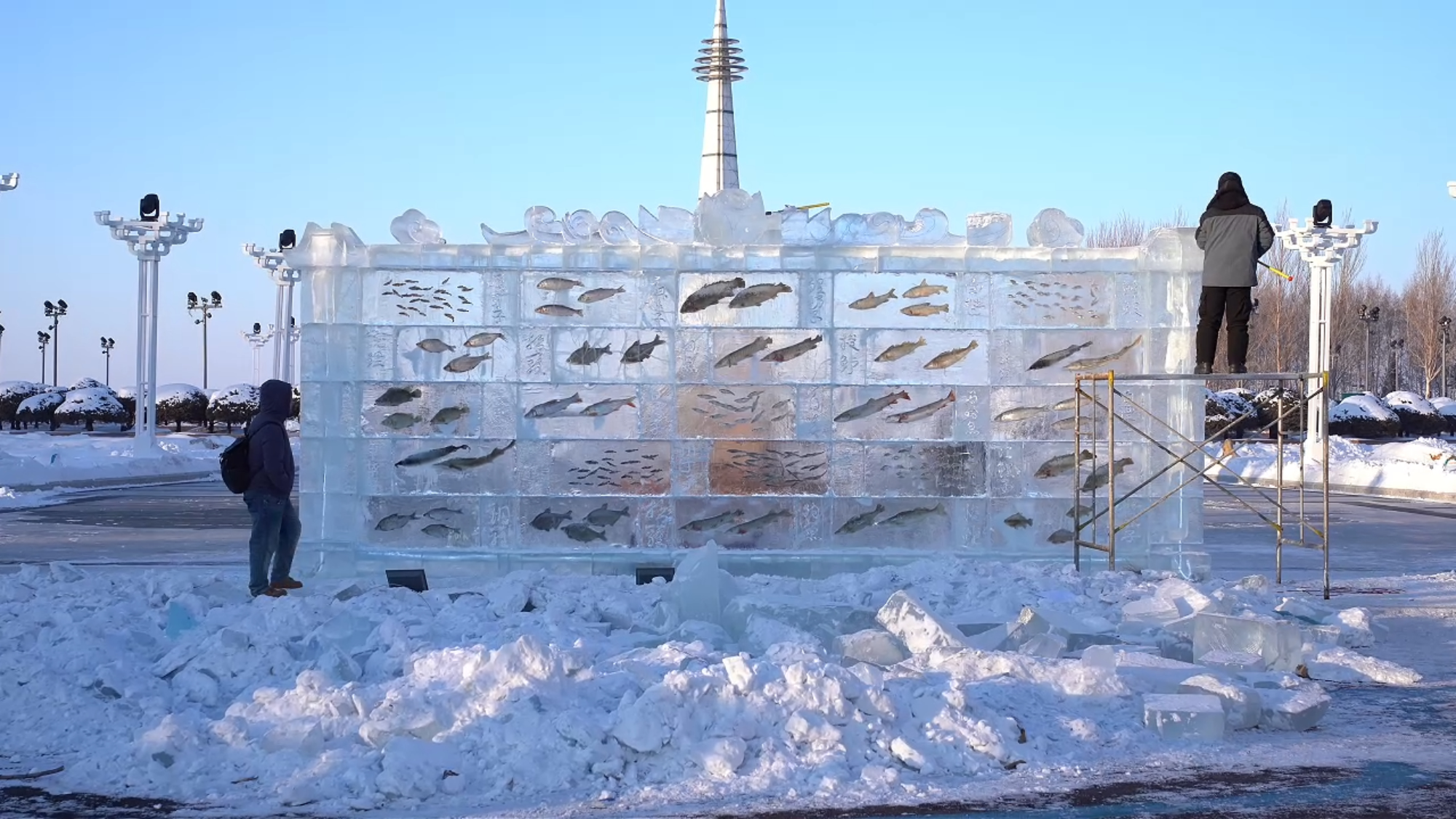 在三江口生态旅游区,冰封鱼墙的搭建工作也已启动。工作人员将同江盛产的“三花五罗十八子”精心嵌入透明冰砖之中,层层垒砌成独具特色的冰封鱼墙景观。墙面上,形态各异的“三花五罗十八子”仿佛定格在冰层内,既生动展现了同江“鱼米之乡”的物产丰饶,又将赫哲族渔猎文化与冰雪艺术巧妙融合。待全部完工后,冰封鱼墙将与俄罗斯风情园的冰雪景观遥相呼应,为游客打造一场集视觉震撼与文化体验于一体的冬日盛宴,进一步擦亮同江“边境冰雪文旅”的特色名片。