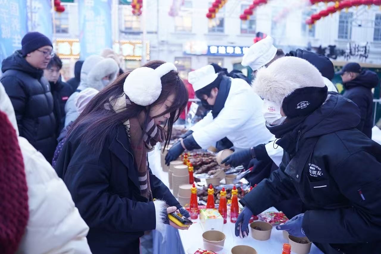 活动现场,5米高的“擎天肉塔”缓缓旋转,俄式肉串滋滋渗出油香,与空气中飘散的红菜汤、大列巴的温暖气息交织在一起。身着彩裙的舞者随着《卡林卡》《民族情》的音乐翩跹跃动,小提琴曲《胜利》《紫色激情》或昂扬或深邃,弦音如诉,一首《喀秋莎》瞬间点燃了现场的气氛。游客们驻足流连,拍照、品尝、互动,在这处微缩的“黑河客厅”里感受黑河的无限魅力。